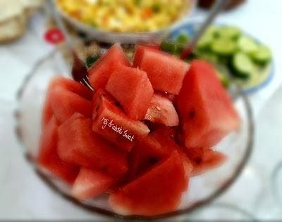 Nasz pierwszy suhur (czyli posilek zjadany przed wschodem slonca w czasie postu) zjedlismy na wariackich papierach. Akurat wrocilismy z podrozy i na szybko przygotowalismy twarog z oliwkami i przyprawami, swieze ogorki oraz arbuza.